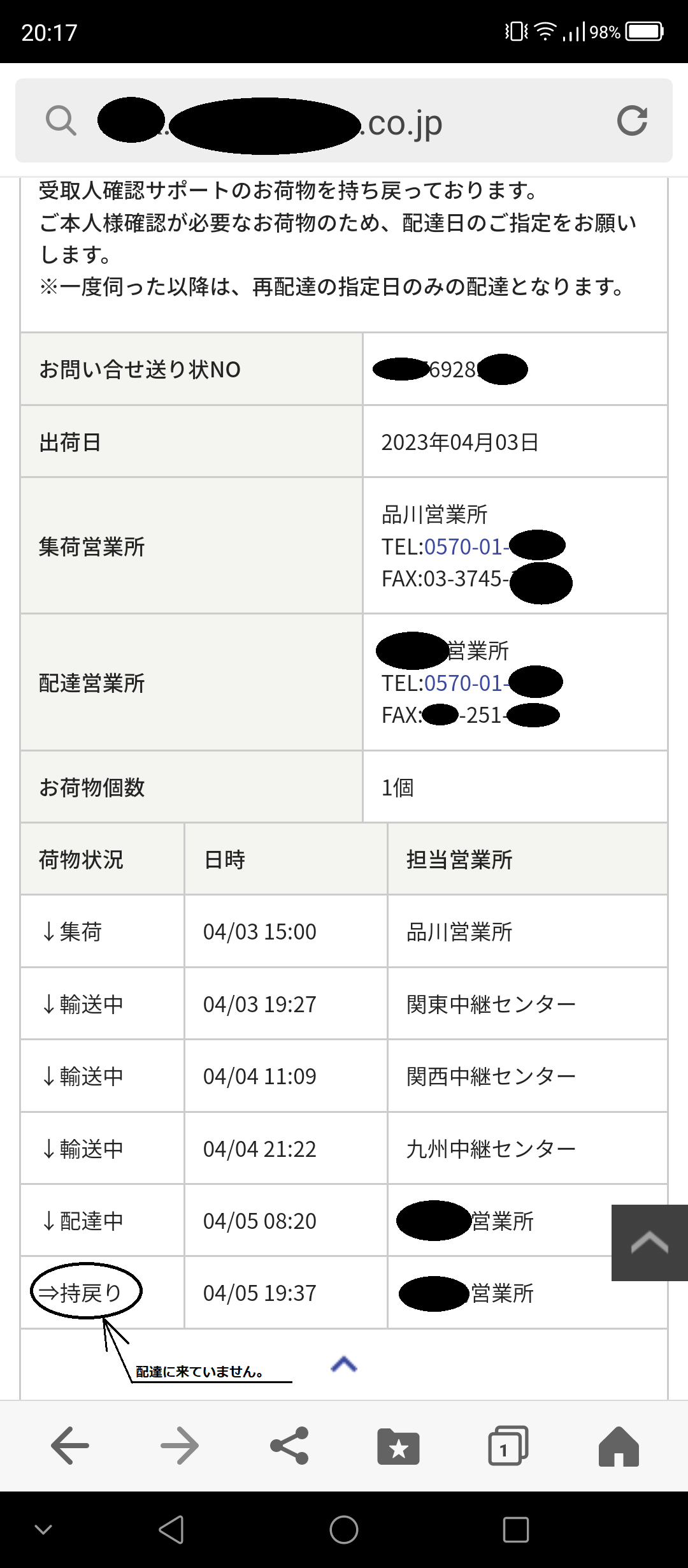 「持戻り」となっていますが、宅配業者は、配達に来ていませんでした。